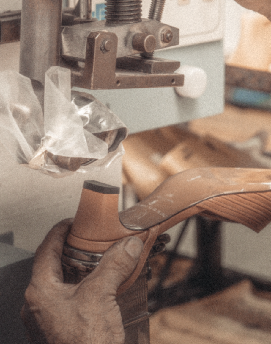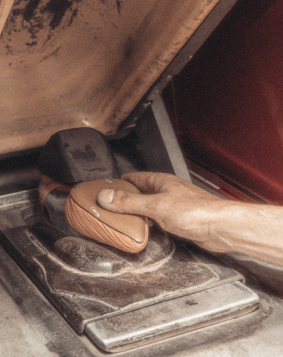The bottom of the upper pieces are being prepared for sole mounting by removing redundant leather to ensure straight and even soles. Then a water-based glue is applied to the entire bottom of the insoles. The heels are positioned. Heel caps are applied before the heels are nailed to ensure they stay in place - also when walking. The soles are then manually applied and shaped into its perfect position before they are finally put under pressure by a machine to ensure that the shaped edges of the soles remain even and in place.