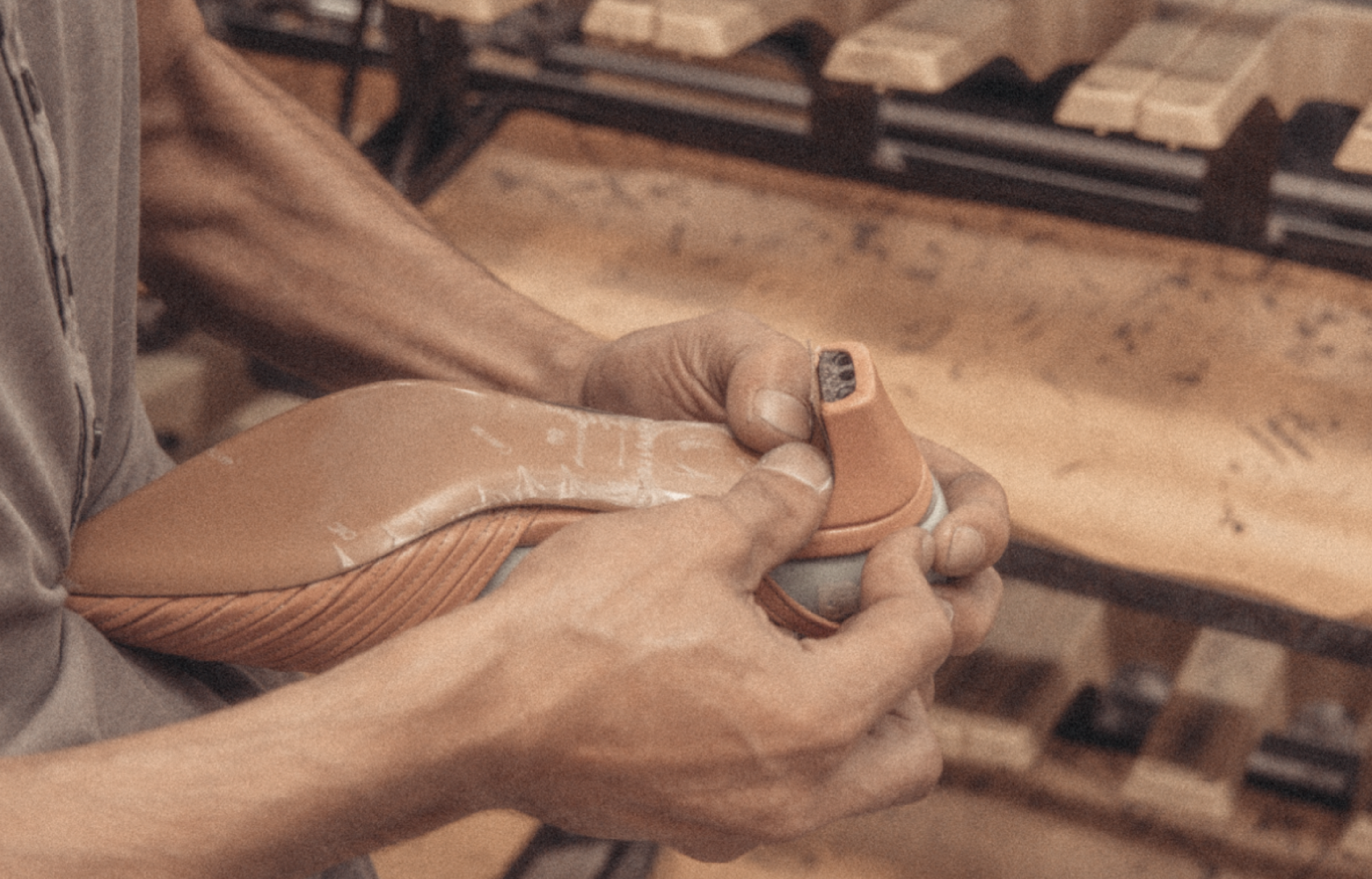 Each shoe pattern includes multiple unique pieces. With Givia the front pieces are being reduced in thickness, then folded and hammered manually by hand, strap by strap. The heel piece edges are getting scarved to enhance shaping. Finally, all pieces are being organized in groups.